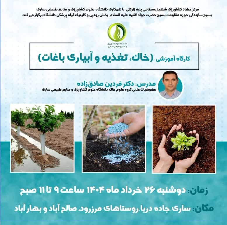 کارگاه تخصصی آموزشی «خاک،تغذیه و آبیاری باغات» با تدریس آقای دکتر فردین صادقزاده، عضو هیأت علمی دانشگاه علوم کشاورزی و منابع طبیعی ساری، روز دوشنبه 26 خردادماه ۱۴۰۴ از ساعت ۹ تا ۱۱ صبح در روستای مرزرود، صالحآباد و بهارآباد واقع در جاده دریا ساری برگزار خواهد شد.